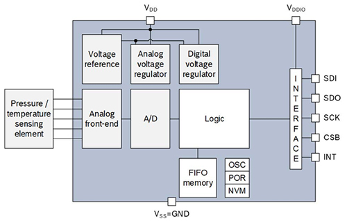 LGA 封裝帶孔,允許外部壓力到達傳感元件。該傳感器為壓阻式傳感器,包括檢測元件和一個通過 I2C 或 SPI 將檢測元件連接到應(yīng)用的 IC 接口。