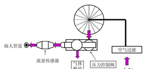 流量傳感器將測量到的實(shí)際值饋送到電子控制部分與面板設(shè)置值比較,利用兩者間的誤差控制伺服閥門來調(diào)節(jié)吸入和呼出氣體流量;