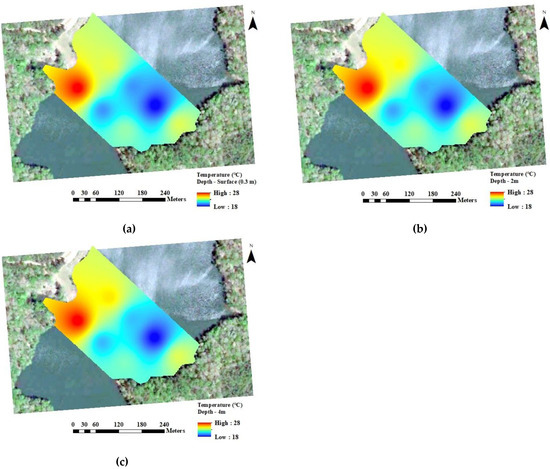 每個位置的測量次數(shù)取決于水深。深度測量表明下降過程中探頭的深度。因此,一旦探頭到達水柱底部,就有望進行重復測量。在一定深度后重復進行的測量被指定為該采樣位置的最大水深。收集的水深和溫度數(shù)據(jù)用于創(chuàng)建測深圖和水溫圖,以可視化地表(0.3 m)以及2 m和4 m深度處的水溫分布。逆距離加權插值(IDW)方法用于ArcMap(ESRI,Redlands,CA,美國)中的處理和插值。27 ]。評估水深,水溫和位置之間的關系。在R軟件(R-GUI,維也納,奧地利)驅動的3D散點圖中說明了水溫分布[ 28 ]。
