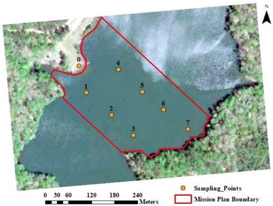 由于聯(lián)邦航空局(FAA)施加的飛行限制和電池電量的限制,在湖的一小部分中進行了水溫剖面試驗。美國聯(lián)邦航空局(FAA)要求無人機飛行必須在視線范圍內,且最高高度應高于地面120 m [ 25 ]。由于這些限制,采樣位置被選擇在無人機能夠以有限的電池電量訪問而又保持在視線范圍內的區(qū)域。圖3中的地圖將無人機發(fā)射位置標記為零,并將水采樣位置標記為數(shù)字1到7。。無人機發(fā)射地點沒有樹木,為安全起降提供了平坦的地面。水采樣位置以網(wǎng)格采樣方式分配,同時分散以提供水溫測量值,以代表任務計劃邊界內的整個區(qū)域。采樣位置之間的距離為80 m至90 m。從發(fā)射點到采樣點一的最短飛行距離為73 m,從發(fā)射點到采樣點七的最長的飛行距離為290 m。