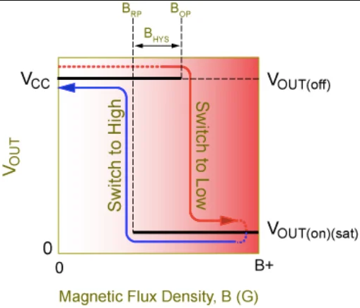 呈現(xiàn)出足夠強(qiáng)度(磁通密度)的正磁場(南極)的磁體將導(dǎo)致設(shè)備切換到導(dǎo)通狀態(tài)。一旦打開,單極IC將保持導(dǎo)通狀態(tài),直到磁場消失并且IC恢復(fù)為截止?fàn)顟B(tài)為止。