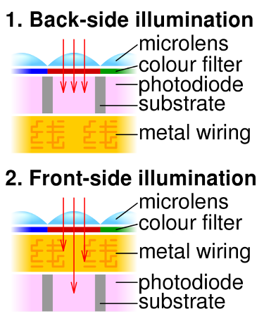背面照明(BSI或BI)提供了一種有趣的選擇,因為控制電子設(shè)備不會限制光敏區(qū)域。但是,光以較低的量子效率(到達傳感器的光子數(shù)與在終端收集的電荷載流子數(shù)之比)進一步傳播。下圖說明了背面和正面照明。