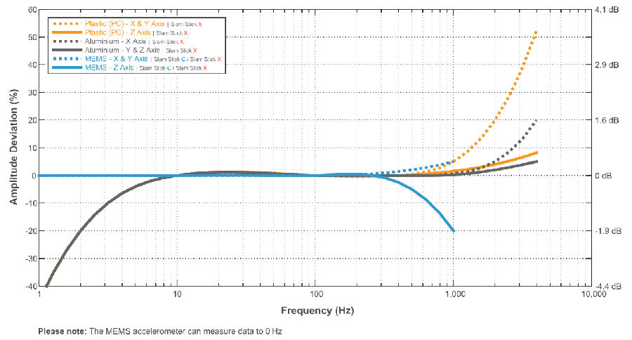 通常將帶寬指定為相對于參考頻率靈敏度(通常為100 Hz)的公差帶。可以以百分比和/或dB為單位指定公差帶,典型的頻段為±5%,± 10%,  ±1 dB甚至±3 dB。大多數(shù)數(shù)據(jù)手冊都會提供典型的頻率響應曲線,以為用戶提供幫助。下面以enDAQ傳感器(以前為Slam Stick)的頻率響應為例(摘自數(shù)據(jù)表);它也方便地將分貝與百分比偏差進行比較。