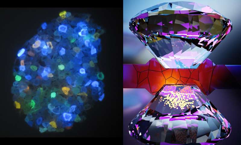 左圖是天然鉆石由于其不同的氮空位(NV)中心而在紫外線下發(fā)光。右側(cè)是示意圖,顯示了正在運行的金剛石砧,NV中心位于底部砧。NV傳感器在被激光激發(fā)時會發(fā)出明亮的紅色陰影。通過探測這種熒光的亮度,研究人員能夠看到傳感器如何響應(yīng)環(huán)境中的細微變化。(圖片來源:姚諾/伯克利實驗室;埃拉·馬魯申科)
