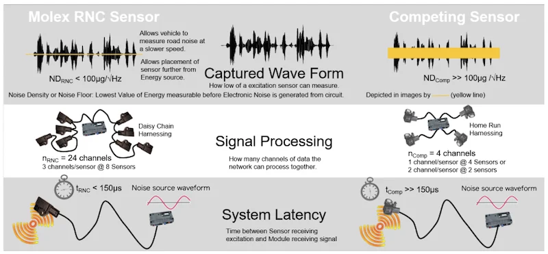 EV的優(yōu)點(diǎn)之一是靜音推進(jìn),但從設(shè)計(jì)和用戶角度出發(fā),權(quán)衡是道路噪音問(wèn)題。Molex表示,其新傳感器與ADI網(wǎng)絡(luò)技術(shù)一起可通過(guò)縮短聲波消除時(shí)間并減輕布線重量來(lái)幫助改善RNC。