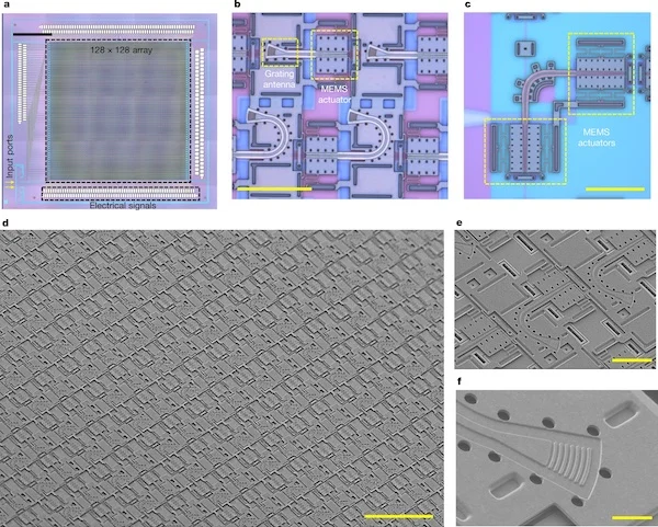 由此產(chǎn)生的設(shè)備在 1 平方厘米的固態(tài)芯片上創(chuàng)建了 128x128 像素陣列。研究人員聲稱,該芯片上的 16,348 像素遠(yuǎn)遠(yuǎn)超過了之前達(dá)到的數(shù)量,使其成為市場(chǎng)上分辨率的固態(tài) FPSA 芯片。