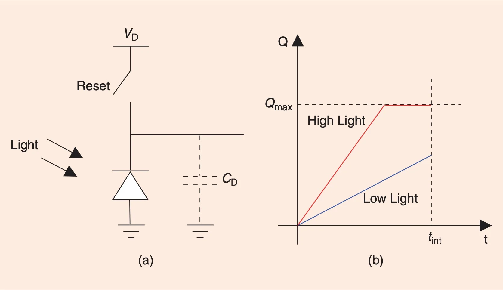 復(fù)位開關(guān)在曝光周期開始時(shí)閉合,以將光電二極管反向偏置到電壓 VD。接下來,開關(guān)打開并產(chǎn)生與入射光強(qiáng)度成比例的光電流。該電流在毫微微安培到微微安培范圍內(nèi),并且太小而無法直接測量。如果我們讓光電二極管暴露在光線下一段設(shè)定的時(shí)間,著色,電流將在二極管電容 CD 上積分。存儲(chǔ)的電荷為我們提供了更容易測量的更強(qiáng)的累積信號。此外,所包含的平均過程使累積的信號更忠實(shí)地表示測量的光強(qiáng)度,尤其是在處理微弱或嘈雜的信號時(shí)。