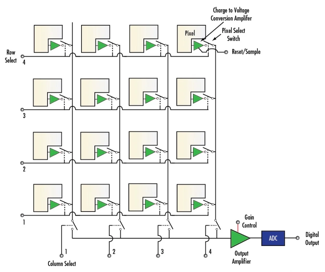 光電探測器的二維陣列用于感測入射光強(qiáng)度。光電探測器產(chǎn)生的電荷被轉(zhuǎn)換為電壓信號,并通過“行選擇”和“列選擇”開關(guān)陣列傳遞到輸出放大器。ADC 用于數(shù)字化放大的信號。