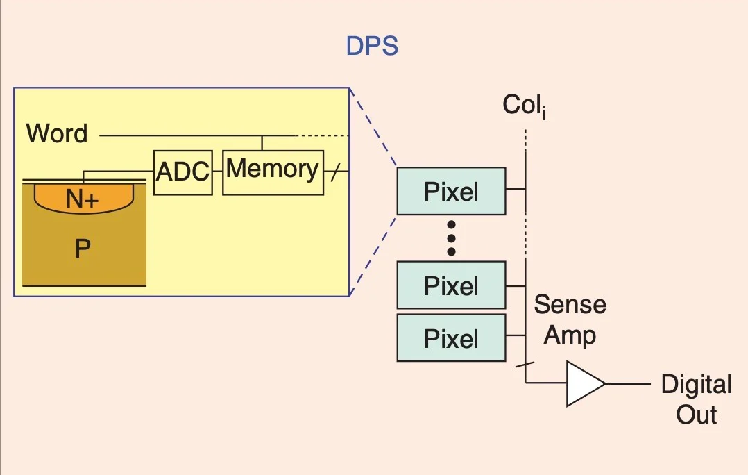 上圖顯示了一個(gè) APS(主動(dòng)像素傳感器)架構(gòu)。在 APS 器件中,每個(gè)像素位置不僅包含光電二極管,還包含放大器。一種更簡單的架構(gòu),稱為 PPS(無源像素傳感器),不會(huì)將放大器集成到像素中。在 DPS(數(shù)字像素傳感器)設(shè)備中,每個(gè)像素都有自己的模數(shù)轉(zhuǎn)換器和內(nèi)存塊。因此,DPS 架構(gòu)中的像素輸出與光強(qiáng)度成比例的數(shù)字值。