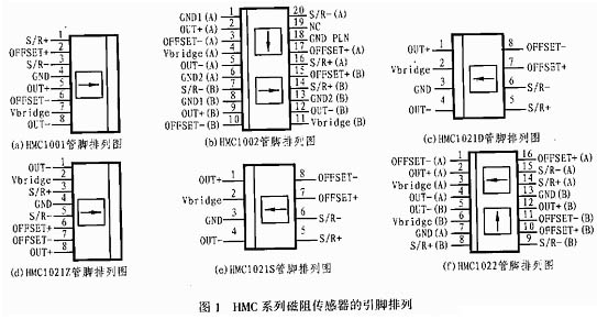 ●集成度高,片內(nèi)集成了霍尼威爾公司取得專利的置位/復(fù)位技術(shù),因而可以減少溫度漂移、非線性及在高磁場(chǎng)環(huán)境中對(duì)輸出信號(hào)造成的影響。而片內(nèi)偏置電路則可消除磁場(chǎng)失真的影響。HMC系列磁阻傳感器的主要型號(hào)如表1所列,圖1所示是其中6種型號(hào)的引腳排列和定義。