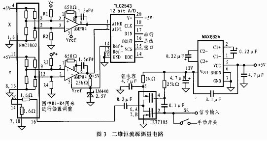 圖2所示是一個(gè)一維恒流源的測(cè)量和數(shù)字接口電路,其二維恒流源的測(cè)量及數(shù)字接口電路如圖3所示。