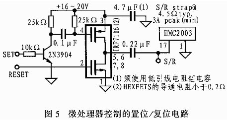 圖5是一種可在微處理器的控制下產(chǎn)生大于4A的置位/復(fù)位強(qiáng)脈沖電路圖。利用該電路可在微處理器的控制下產(chǎn)生置位和復(fù)位信號(hào)以控制HEXFET驅(qū)動(dòng)器(IRF706)的P和N通道。引入TRS和TSR延時(shí)的目的是確保在一個(gè)HEXFET開(kāi)通之前使另 個(gè)HEXFET閉合,這類似一個(gè)先開(kāi)后保的開(kāi)關(guān)接點(diǎn)。利用這一開(kāi)關(guān)可在4.7μF電容和脈沖輸出點(diǎn)之間串接一個(gè)500Ω的分壓電阻。如果不使用微處理器,也可用時(shí)鐘信號(hào)來(lái)觸發(fā)置位和復(fù)位信號(hào)。