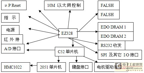本文的課題背景是一個(gè)機(jī)器人玩具的控制系統(tǒng)設(shè)計(jì),主芯片采用的是以摩特羅拉公司的MC86EZ328芯片,只完成與通信、運(yùn)算等有關(guān)的主要操作,在沒(méi)有操作時(shí),由運(yùn)行于其上的操作系統(tǒng)uClinux來(lái)維護(hù)。對(duì)于所有與EZ328的核心運(yùn)算、控制、通信、操作無(wú)關(guān)的外圍設(shè)備的維護(hù)和控制都通過(guò)一塊AT89C52來(lái)完成,它與EZ328的底層通信協(xié)議為同步串口協(xié)議(SPI),在AT89C52中由軟件來(lái)實(shí)現(xiàn)。C52包含的部件主要是A/D轉(zhuǎn)換器,鍵盤(pán)接口,電機(jī)驅(qū)動(dòng)模塊。硬件結(jié)構(gòu)電路圖如下圖1:
