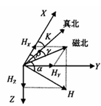 HMC的輸出電壓為磁場(chǎng)強(qiáng)度為0時(shí)傳感器的輸出。所以當(dāng)U0為0時(shí), Uout正比于磁場(chǎng)強(qiáng)度B。如圖4,假設(shè)機(jī)器人處于水平面上,X為機(jī)器人行進(jìn)方向,Y為水平面上垂直X的方向向右(即X順時(shí)針轉(zhuǎn)90),地里北極方向和地磁北極方向如圖所示。H為地磁場(chǎng),Hx、Hy分別是H在X、Y方向的水平分量, β為機(jī)器人行進(jìn)方向和地磁北極方向的夾角, γ為地磁北極和地理北極方向的夾角,K就是機(jī)器人行進(jìn)方向與地理北極方向之間的夾角,也就是我們最終要求的角度。(此處的β、γ、 K都是由前者出發(fā)順時(shí)針到達(dá)后者的角度)由圖可明顯看出,K= β-γ。而在地球上不同方位的γ可查表得出,所以關(guān)鍵就是求得 。由磁阻傳感器可以得出Hx、Hy,(此處忽略了機(jī)器人在Z軸方向的傾斜,所以二維傳感器就夠用了),。