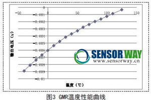 將GMR芯片放入高低溫無磁溫度箱中,每隔10℃記錄一次數(shù)據(jù),監(jiān)測傳感器從-40℃~+125℃隨溫度變化的漂移性,具體如圖3所示,芯片在整個溫度范圍內輸出變化9.075mv,溫度系數(shù)為0.055mV/℃,可見GMR傳感器芯片的溫度性能比較優(yōu)越。