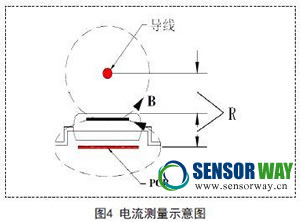 巨磁電阻用于電流檢測一般采用如圖4所示的方式進行,將磁傳感器放置通電導線的正上方或正下方,同時保證通電導線產(chǎn)生磁場的方向與磁傳感器的敏感方向一致。按照通電導線周圍產(chǎn)生磁場的理論計算公式2-1可知,在待測電流和傳感器相對位置一定的情況下,待測電流的大小和磁場大小成正比,利用公式2-2這樣就可以直接測量待測電流產(chǎn)生的磁場值,再結合公式2-1就得出待測電流的大小。