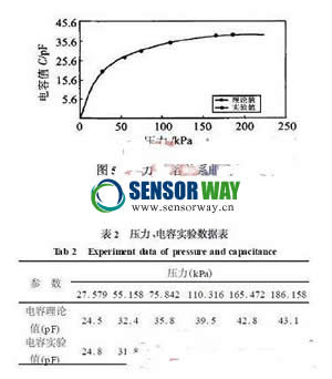 由1可見,擬合的電容誤差小于1%.由此可見,在不同的時(shí)刻測(cè)得UO(t),通過曲線擬合得出參數(shù)RC.再給電路加小信號(hào)直流電源,測(cè)出R值,即求得C,通過C值則可知被測(cè)環(huán)境的壓力。圖5為350℃時(shí),不同的壓力所對(duì)應(yīng)的電容的理論值和實(shí)驗(yàn)值,從實(shí)驗(yàn)數(shù)據(jù)(表2)可得,在測(cè)壓的過程中,利用模型識(shí)別的方法,誤差較小,其測(cè)壓誤差小于2%.