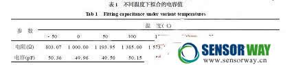 擬合參數(shù)最大時(shí)為5.037×10-8,最大相對(duì)誤差為0.78%.當(dāng)溫度變化時(shí),金屬鉑電阻值發(fā)生變化,在不同的溫度下擬合的電容值和溫度的關(guān)系如表1所示(加入1%的白噪聲)。