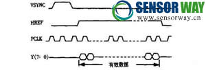 VSYNC是垂直場同步信號(也是每幀同步信號,CMOS是按列采集圖像的),其下降沿表示一幀圖像的開始,HREF提供了一種有效的控制方式,當(dāng)輸出像素行列分別處于設(shè)定窗口之間時HREF為有效高電平,此時輸出有效的視頻數(shù)據(jù),PCLK是輸出數(shù)據(jù)同步信號,上升沿輸出一個有效的像素Y[7∶M].