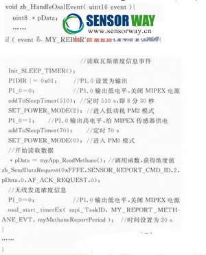 無線瓦斯傳感器節(jié)點的工作流程主要是在zb_HandieOsalEvent(events)編程實現(xiàn)的,具體程序為: