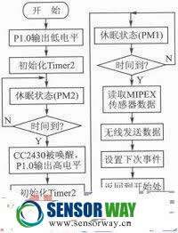 根據(jù)傳感器的操作要求,設置無線瓦斯傳感器按照以下的流程進行工作。節(jié)點處于工作/休眠交替狀態(tài),一個工作周期約為10 min.在前8分30秒中CC2430的P1.0引腳輸出低電平,控制MIPEX傳感器不工作。緊接著,CC2430進入低功耗運行模式。8分30秒過后,CC2430被喚醒,P1.0引腳輸出高電平,即給MIPEX傳感器供電。此時CC2430進入PM1低功耗模式。由于MIPEX傳感器的熱身時間為1min,這里設置70s后,CC2430被喚醒,開始讀取MIPEX中的瓦斯?jié)舛刃畔,然后將其無線發(fā)送出去。待發(fā)送完畢后,設置下一次瓦斯?jié)舛茸x取事件,周期為20 s,這20 s內(nèi),CC2430自動進入低功耗模式。20 s之后,觸發(fā)該事件,并送給應用層處理,開始了上述循環(huán)過程。程序設計的具體流程如圖1所示。