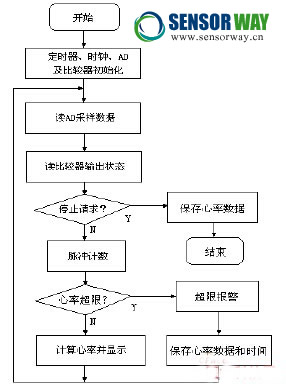 程序主流程如圖6所示,包括CPU初始化、LCD初始化、時鐘初始化、溫度傳感器18b20初始化、軟硬件自檢、讀取溫度和時間、按鍵掃描與控制等。由于心率檢測需24小時持續(xù)進(jìn)行,因此,系統(tǒng)應(yīng)循環(huán)檢測,直到用戶按停止鍵。