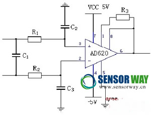前置放大電路對于脈搏波信號采集來至關(guān)重要,考慮到脈搏信號的特點(diǎn),心率信號采集屬于強(qiáng)噪聲環(huán)境下的微弱生理信號檢測,要求放大器具有高共模和差模輸入阻抗;低輸出阻抗、精確和穩(wěn)定的增益、高共模抑制比;谝陨戏治,選用ANALOG DEVICES退出的低功耗、高精度儀表放大器AD620作為前置放大的核心器件。放大電路設(shè)計如圖2所示。AD620由三個放大器組成,內(nèi)部采用三運(yùn)放典型電路,可實現(xiàn)1~1000增益任意調(diào)節(jié),其調(diào)節(jié)是通過引腳1和8的連接阻抗R3實現(xiàn)。
