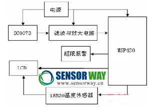 心率是人體非常重要的生理參數(shù),而傳統(tǒng)的脈診由于其非定量和主觀性影響了心率測試的精度,為了提高對心率監(jiān)測的精度和監(jiān)測的方便性,本系統(tǒng)采用壓電陶瓷傳感器和MSP430芯片組成測試系統(tǒng),系統(tǒng)硬件結(jié)構(gòu)如圖1所示。通過ADC10片上溫度傳感器采集溫度,就可以在數(shù)碼管上顯示。同時SC0073壓電陶瓷傳感器采集的信號經(jīng)濾波和放大后與設(shè)定壓力閾值進(jìn)行比較,對脈搏波信號進(jìn)行處理,并根據(jù)處理結(jié)果進(jìn)行精確計數(shù)和顯示。