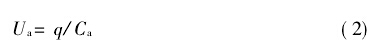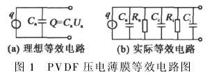 式中q為極板上聚集的電荷量;Ca為PVDF壓電薄膜兩個(gè)表面間的等效電容。所以,可以把PVDF壓電薄膜看成是一個(gè)等效電荷源和一個(gè)電容器相并聯(lián),如圖1(a)所示。在實(shí)際測(cè)量中,PVDF壓電薄膜傳感器還必須考慮外接電路的電容和電阻,因此,PVDF壓電薄膜傳感器的實(shí)際等效電路[4]如圖1(b)所示。在此等效電路中,傳感器的絕緣電阻與前置放大器的輸入電阻相并聯(lián),為了保證傳感器的低頻響應(yīng),盡量減少靜態(tài)測(cè)量誤差,要求傳感器的絕緣電阻應(yīng)保持在1 013Ψ以上,才能使電荷泄露減少到滿足精度要求。同時(shí)前置放大器要有較大的輸入電阻,以防止傳感器的電荷通過(guò)輸入電路泄露。