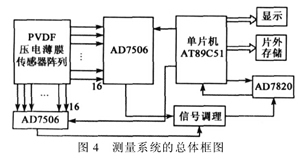系統(tǒng)的工作原理是在單片機(jī)的控制下,由切換電路完成對(duì)傳感單元的選擇,被選擇的PVDF壓電薄膜傳感器經(jīng)電荷-電壓轉(zhuǎn)換及相應(yīng)的信號(hào)調(diào)理電路變成0~5V的電壓信號(hào),再經(jīng)過(guò)AD7820進(jìn)行模數(shù)轉(zhuǎn)換,轉(zhuǎn)換結(jié)果通過(guò)AT89C51暫存于片外存儲(chǔ)單元(本文采用靜態(tài)RAM芯片62256),并在檢測(cè)完畢后,通過(guò)RS232串行通信接口傳送到計(jì)算機(jī)進(jìn)行處理與顯示。測(cè)量系統(tǒng)的結(jié)構(gòu)框圖如圖4所示。