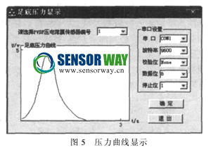 數(shù)據(jù)采集和模數(shù)轉(zhuǎn)換是借助DP-51PROC單片機(jī)綜合仿真實(shí)驗(yàn)儀來(lái)完成的。采集的數(shù)據(jù)通過(guò)RS-232串口通信傳送至計(jì)算機(jī)進(jìn)行處理與顯示。本文用VC+ +6.0編程實(shí)現(xiàn)串口通信,并進(jìn)行數(shù)據(jù)處理。測(cè)試時(shí),由人體足底前掌部對(duì)傳感器陣列施加一動(dòng)態(tài)壓力,經(jīng)過(guò)數(shù)據(jù)處理,可獲取每只傳感器對(duì)應(yīng)的壓力曲線。圖5為某一時(shí)刻,第1只PVDF壓電薄膜傳感器(位于第5跖骨)對(duì)應(yīng)的壓力曲線。僅從圖形上相比較,該結(jié)果與文獻(xiàn)記載的足底壓力曲線相似。一旦對(duì)PVDF壓電薄膜進(jìn)行標(biāo)定,便能準(zhǔn)確測(cè)量出該部位在任一時(shí)刻的壓力大小。