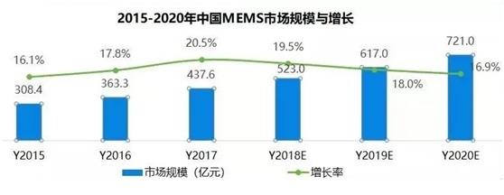Yole Developement 數(shù)據(jù)顯示,全球MEMS傳感器產(chǎn)品需求近年增勢(shì)迅猛,2017年MEMS傳感器市場(chǎng)規(guī)模為437.6億元,平均以超過15%的增長(zhǎng)率增長(zhǎng),2020年預(yù)計(jì)將達(dá)到721億元。