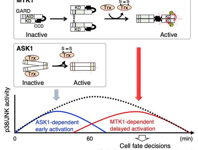 一個研究小組在醫(yī)學(xué)科學(xué)的東京日本大學(xué)研究院,由Mutsuhiro Takekawa教授為首,已發(fā)現(xiàn)一種新的機制,是引起通過檢測細胞反應(yīng)的氧化應(yīng)激在人體內(nèi)。MTK1 SAPKKK被認(rèn)為是一種新型的人類氧化應(yīng)激傳感器,可以感應(yīng)體內(nèi)過量的活性氧并將該信息傳遞給細胞,從而導(dǎo)致細胞死亡和炎性細胞因子的產(chǎn)生。這項研究的結(jié)果發(fā)表在2020年6月24日的《科學(xué)進展》上。