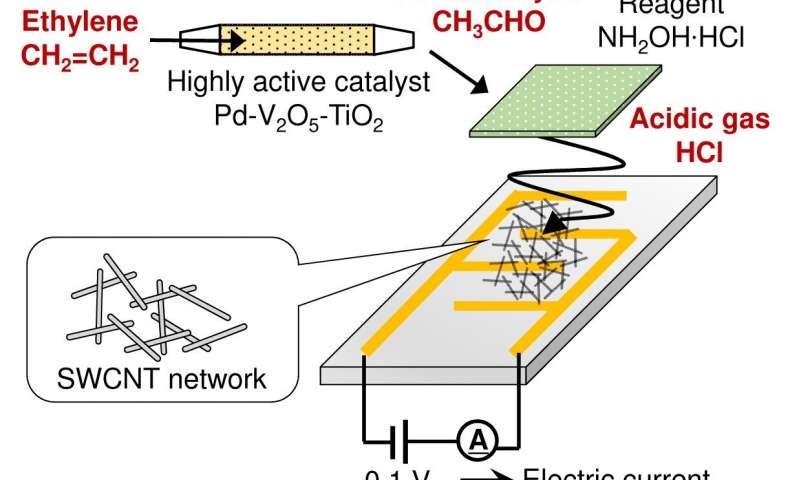 在此研究項目中,我們開發(fā)了一種小型,高靈敏度的傳感器,能夠以高選擇性檢測乙烯。該傳感器由三部分組成:一種高活性催化劑,可選擇性地將乙烯轉(zhuǎn)化為乙醛;一種與乙醛反應(yīng)以釋放酸性氣體的試劑;以及一個對酸性氣體非常敏感的SWCNT(單壁碳納米管)電極(圖)。當分析物空氣通過時,這種高活性催化劑可以將乙烯反復轉(zhuǎn)化為乙醛。此外,該催化劑可在接近室溫(40℃)的條件下運行,從而使小型傳感器具有較高的能源效率。乙醛與試劑之間的反應(yīng)產(chǎn)生的酸性氣體會從SWCNT半導體中強烈吸收電子,從而改變半導體的電阻。這些特性和機制使傳感器能夠通過監(jiān)視電阻變化,即使在極低的濃度(0.1 ppm)下也能夠選擇性和靈敏地檢測乙烯。該傳感器有望有效監(jiān)測多種類型乙烯的乙烯濃度。儲存新鮮農(nóng)產(chǎn)品。例如,促進香蕉和獼猴桃中成熟的乙烯濃度分別約為500 ppm和10 ppm:完全在傳感器的有用靈敏度范圍內(nèi)。