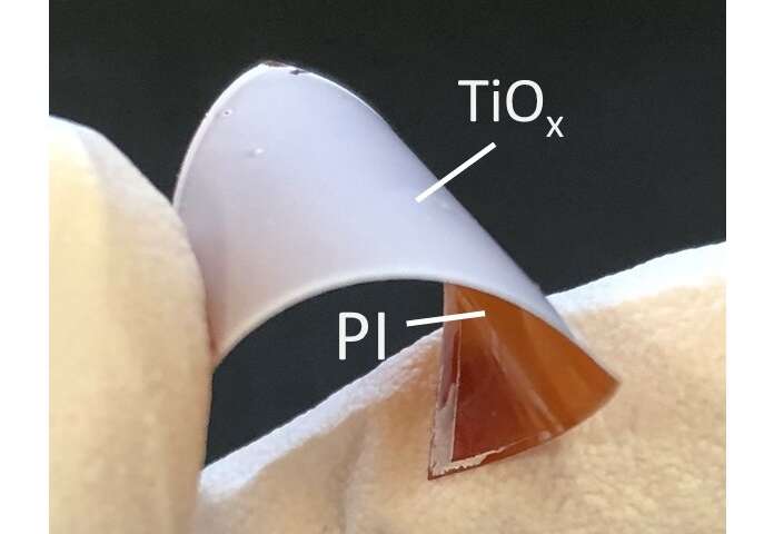 圖1沉積在塑料(PI:聚酰亞胺)基材上的納米結構多孔氧化鈦薄膜(TiOx)。