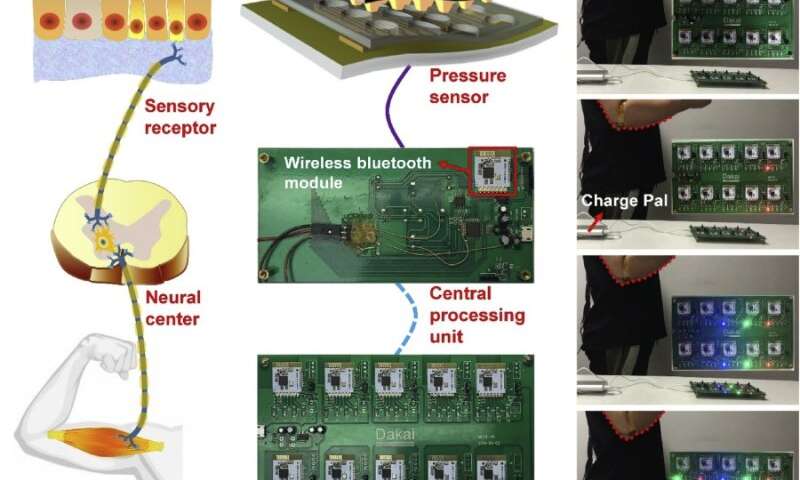 該團(tuán)隊(duì)還設(shè)計(jì)了一個人工體細(xì)胞反射弧,以模仿生物系統(tǒng)中的反應(yīng)。傳感器安裝在志愿者的肘部。隨著志愿者增加彎曲角度,信號通過無線藍(lán)牙模塊傳輸?shù)焦δ軉卧,功能單元中的LED點(diǎn)亮量也增加。