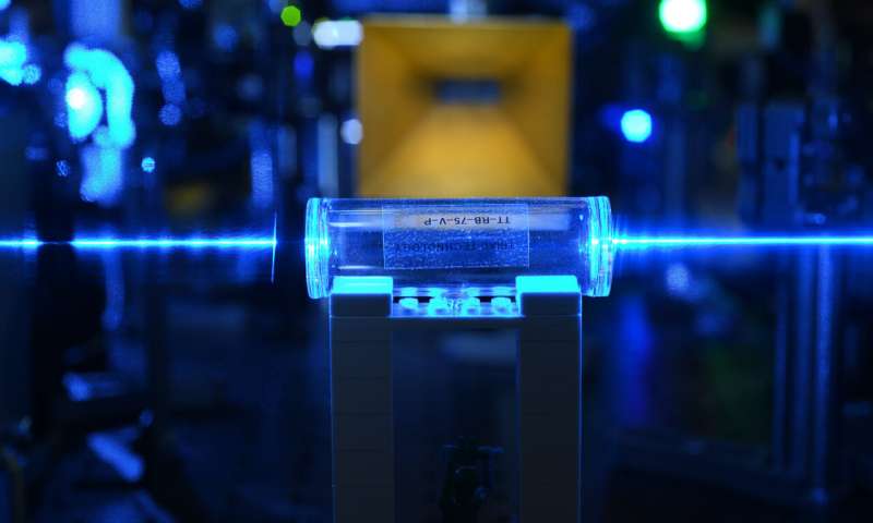 玻璃蒸氣室中的原子被激光束激發(fā)到里德堡態(tài)。它們檢測電場(來自背景中的金天線)并將信息壓印回激光束上。
