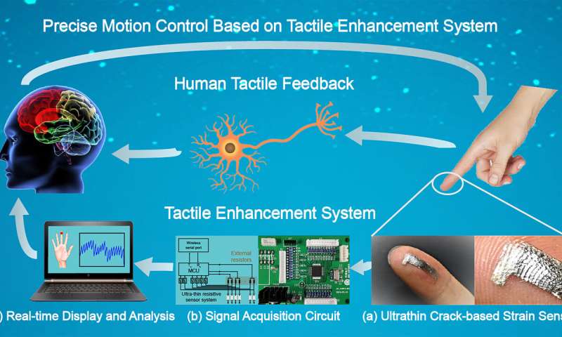 在本周的《應(yīng)用物理評(píng)論》上,科學(xué)家報(bào)告了基于高靈敏度傳感器的新型觸覺增強(qiáng)系統(tǒng)的開發(fā)。該傳感器具有卓越的靈敏度,使佩戴者能夠檢測(cè)出羽毛的光筆,花瓣的觸感,落在手指上的水滴,甚至是太細(xì)小的電線都看不到。