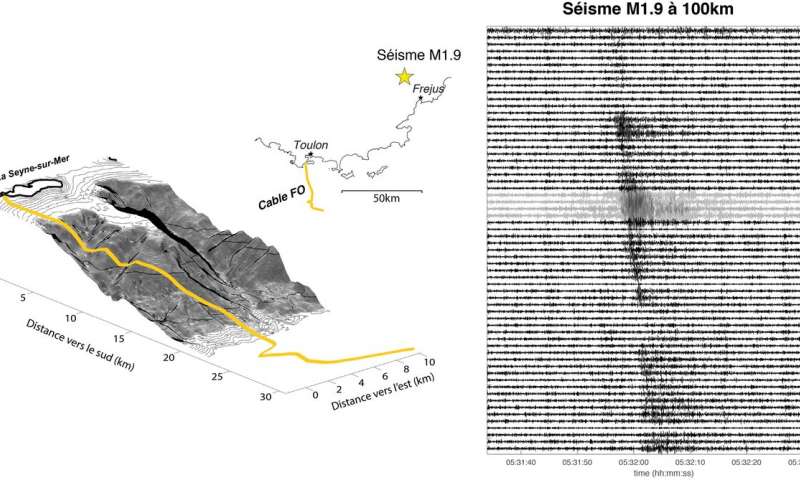 位于弗雷瑞斯(瓦爾)以北的1.9級地震產(chǎn)生的地震波記錄在沿土倫附近海底部署的41公里長的光纜上。在右側(cè)的記錄中,每條線對應(yīng)一個沿著電纜的測量點,從海岸(頂部)到大海(底部)。(41公里的電纜相當于6000多個傳感器)。各個測量點處的波到達時間之差用于確定地震的位置。