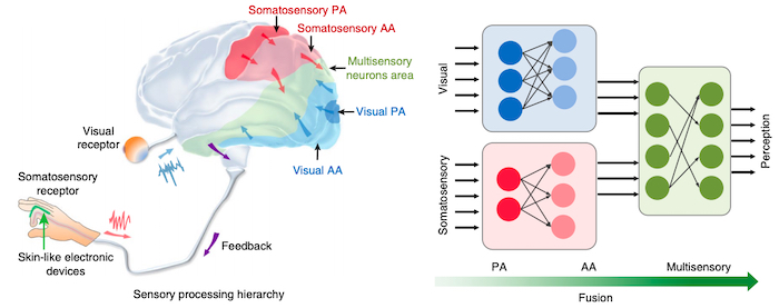 為了應(yīng)對這一挑戰(zhàn),南大新加坡團(tuán)隊開發(fā)了一種“生物啟發(fā)”的數(shù)據(jù)融合系統(tǒng),該系統(tǒng)將類似皮膚的可拉伸應(yīng)變傳感器與AI系統(tǒng)結(jié)合使用。這些技術(shù)結(jié)合在一起,類似于人腦共同處理皮膚的感覺和視覺的方式。