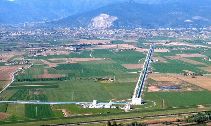 Advanced Virgo探測(cè)器的鳥(niǎo)瞰圖,已安裝并正在測(cè)試CERN使用的精密激光干涉儀。信用:處女座合作