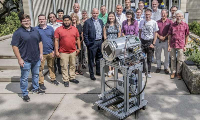Brookhaven Lab的LSST項(xiàng)目團(tuán)隊(duì)的成員將看到一個(gè)原型筏低溫恒溫器。除木筏外,布魯克海文的科學(xué)家還設(shè)計(jì)并制造了低溫恒溫器,可將木筏固定并冷卻至-100攝氏度。圖片來(lái)源:布魯克海文國(guó)家實(shí)驗(yàn)室