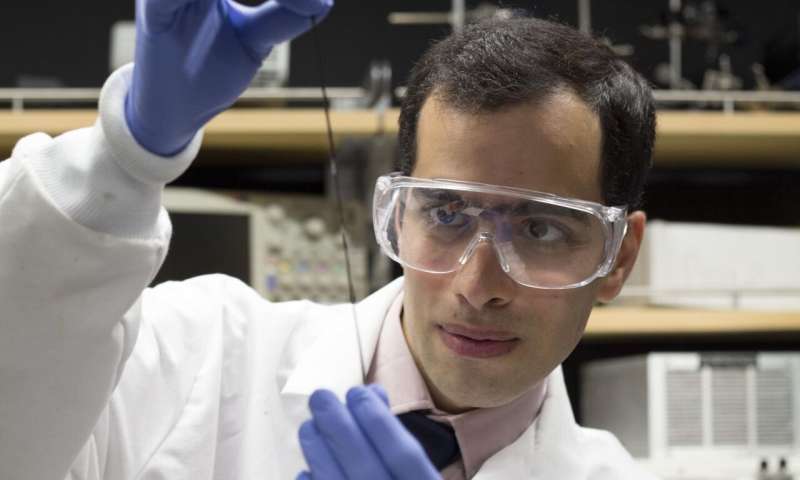 UBC博士生Hossein Montazerian仔細(xì)觀察了嵌入纖維中的微型傳感器。圖片來(lái)源:UBCO Okanagan