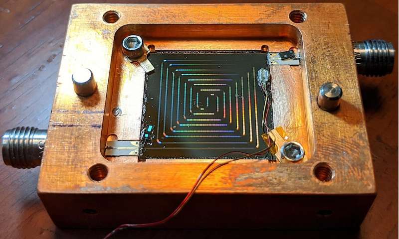 新型溫度計(jì)的尺寸僅為2.5 x 1.15毫米,可以安裝在另一個(gè)低溫微波設(shè)備中或固定在另一個(gè)低溫微波設(shè)備上,以測量安裝在芯片上的溫度。研究人員使用溫度計(jì)演示了超導(dǎo)微波放大器發(fā)熱的快速,準(zhǔn)確測量。