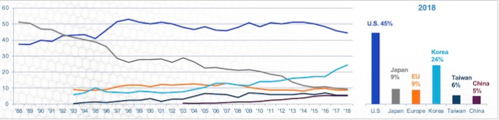 該線圖描述了1988-2018年半導體市場份額的趨勢。條形圖顯示了截至2018年的市場份額。圖片由SIA提供