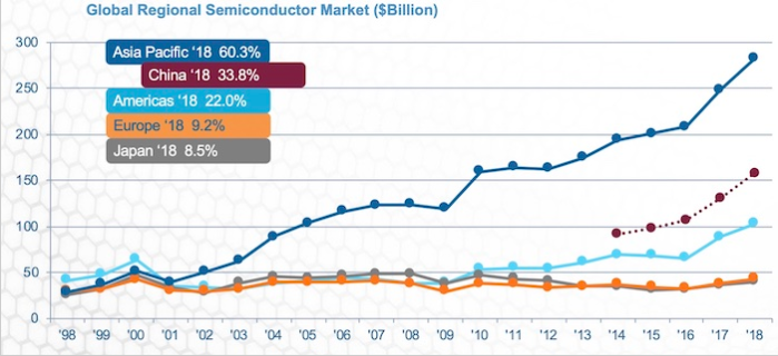 折線圖顯示了全球區(qū)域半導體市場的趨勢。在這里,您可以看到美國的領先地位是在2000年。圖片由SIA提供
