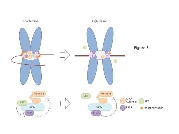 在發(fā)表在《細(xì)胞生物學(xué)雜志》上的最新研究中,Terada 的團(tuán)隊發(fā)現(xiàn) SET/TAF1,一種 AML 的原癌基因,通過微調(diào) Aurora B 和 PP2A 的酶活性,也可用作張力傳感器。由于三個張力傳感器相互作用,復(fù)制的染色體均勻分布到新生細(xì)胞中,防止染色體異常。