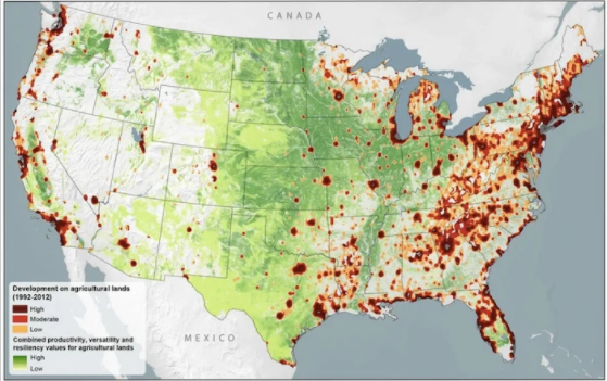 描述 1992 年至 2012 年間農(nóng)業(yè)用地如何轉(zhuǎn)變?yōu)槌鞘泻妥≌_發(fā)項(xiàng)目。圖片由美國農(nóng)田信托基金和現(xiàn)代農(nóng)民提供