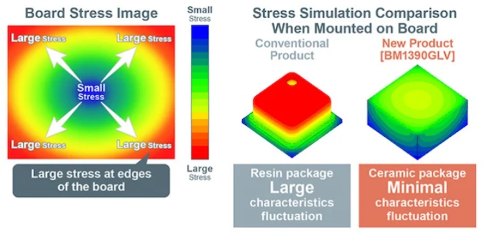BM1390GLV 使用陶瓷封裝,最大限度地減少了安裝應(yīng)力的誤差。下圖顯示了用于新傳感器的陶瓷封裝和傳統(tǒng)傳感器中常用的樹脂封裝的應(yīng)力模擬。