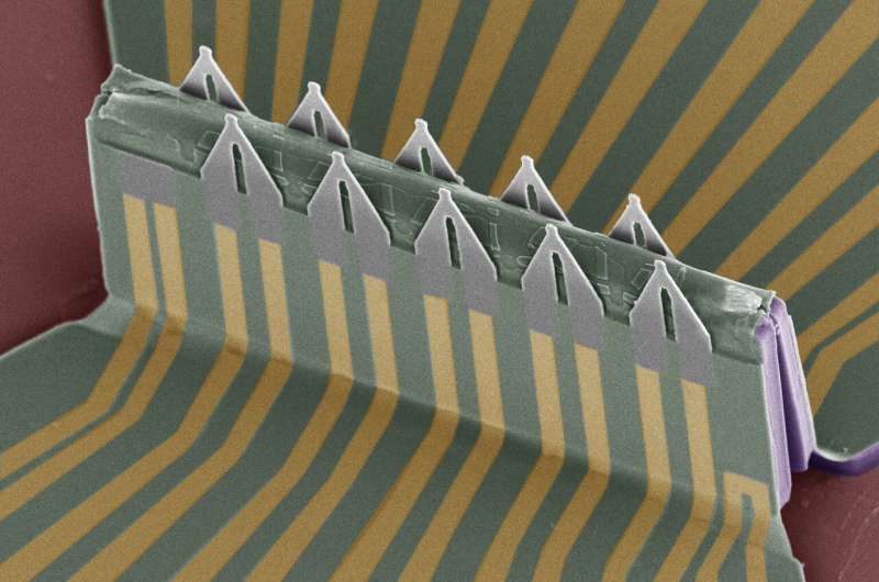 “彈出式”傳感器的 SEM 圖像,可直接測量心臟細胞內電信號的速度和運動。